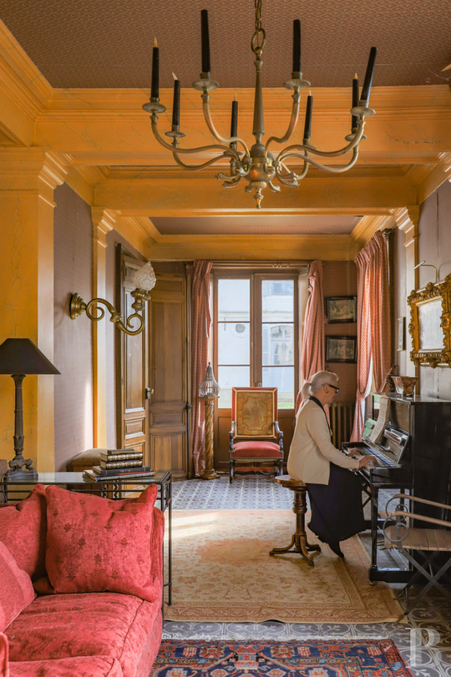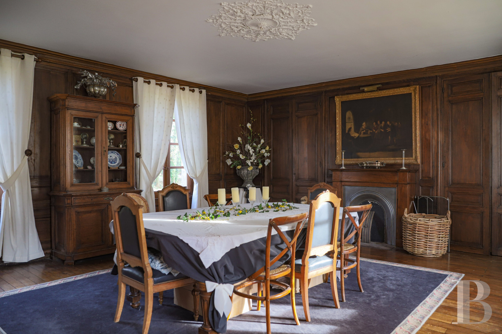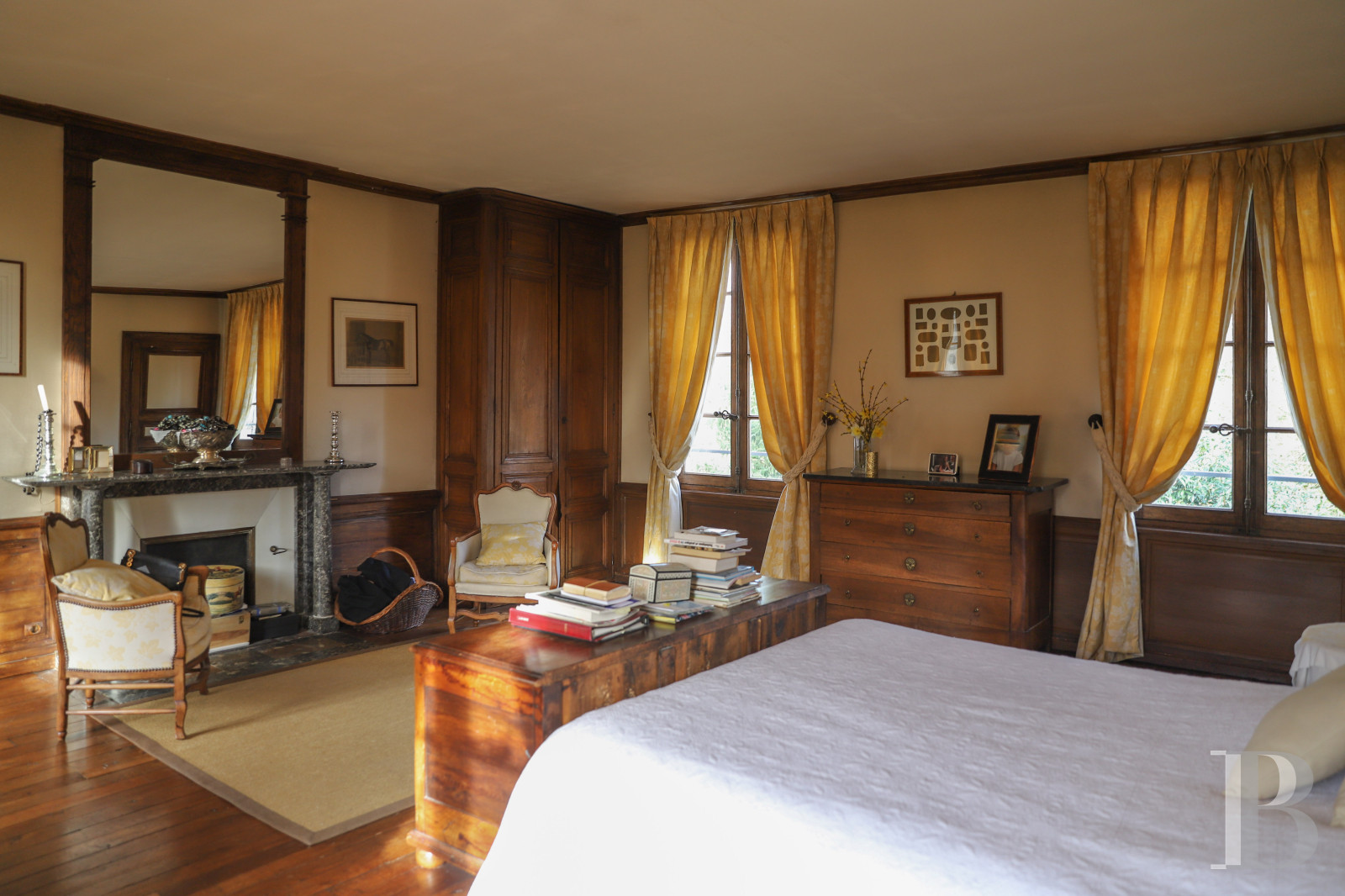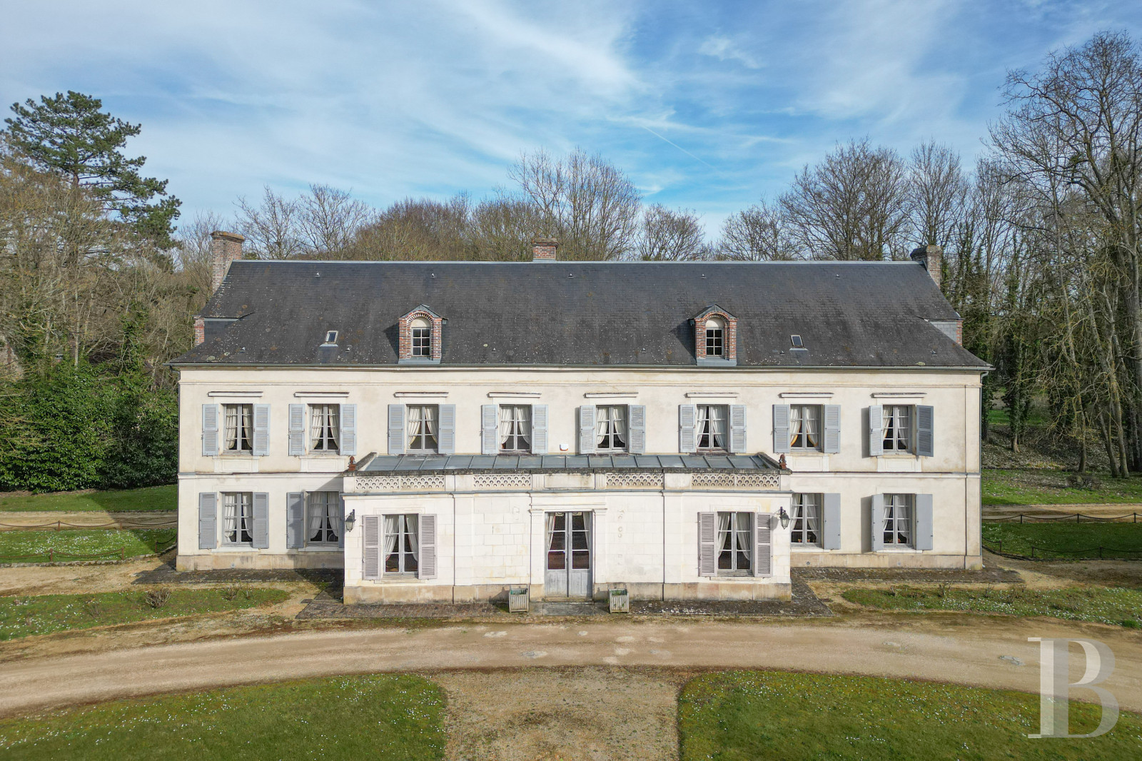 With a surface area of approximately 450 m2, its cut stone facades are pierced, to the east and west, with numerous symmetrically arranged bays with windows with large and small panes, stone frames, and blue-gray shutters.