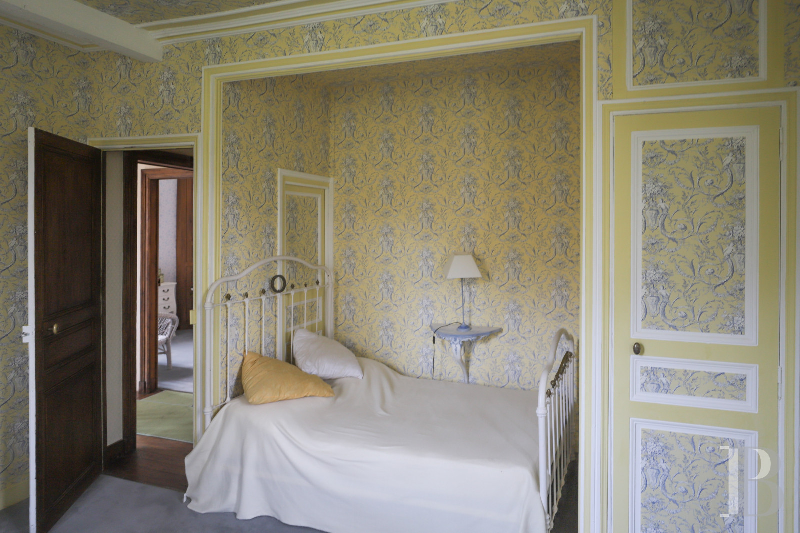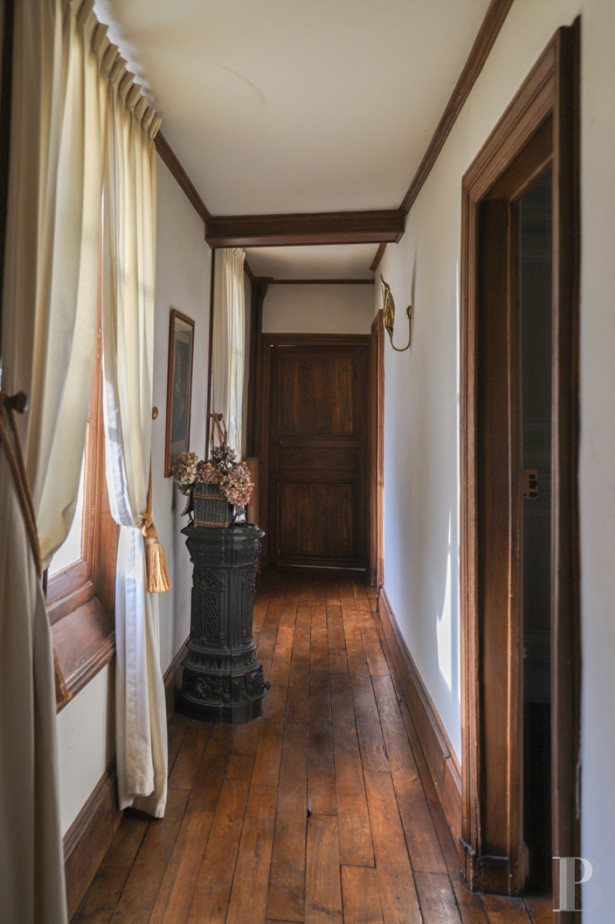 On one side of the landing, a living room with exposed timbers and a bedroom with its bathroom. On the other, a corridor leads to the laundry room and four former maids' rooms currently used as storage rooms. The floors are covered with tiles.
