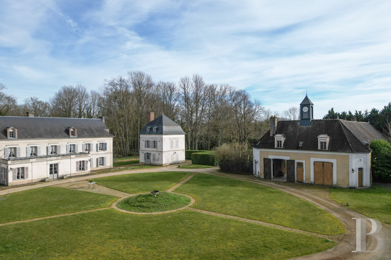 This allows you to contemplate the rectangular castle surrounded by its two “Mansart” style pavilions, On the right, a set of outbuildings, topped with a lantern and equipped with its clock, completes the overall vision.